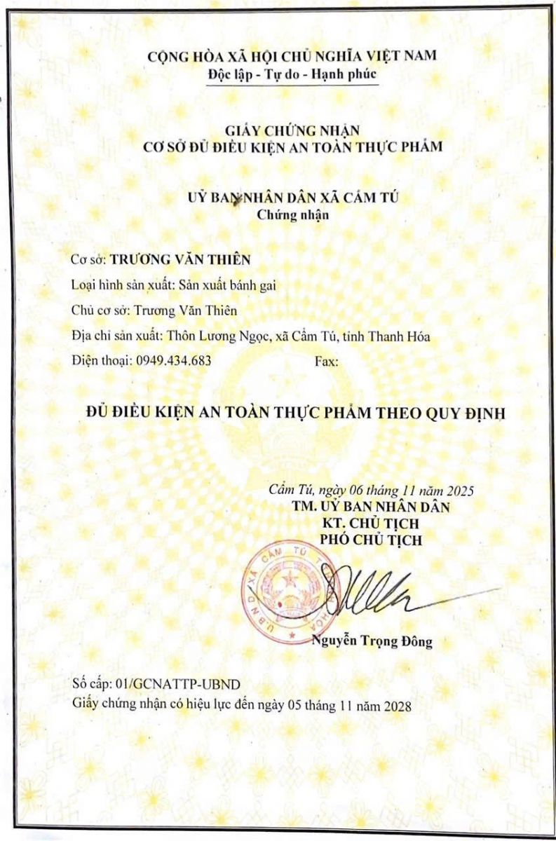 Giữa vùng quê yên bình bên dòng suối cá thần Cẩm Lương nay thuộc xã Cẩm Tú, nơi thiên nhiên và con người hòa quyện, có một mùi hương quen thuộc lan tỏa – hương bánh gai dẻo thơm, ngọt dịu. Từ tình yêu với quê hương và mong muốn lưu giữ hương vị truyền thống, đôi vợ chồng trẻ anh Hộ kinh doanh Trương Văn Thiên đã khởi đầu hành trình làm nên thương hiệu Bánh gai Thiên Dương – món quà quê mộc mạc nhưng chứa đựng trọn vẹn tâm huyết và niềm tự hào của người con xứ Thanh.